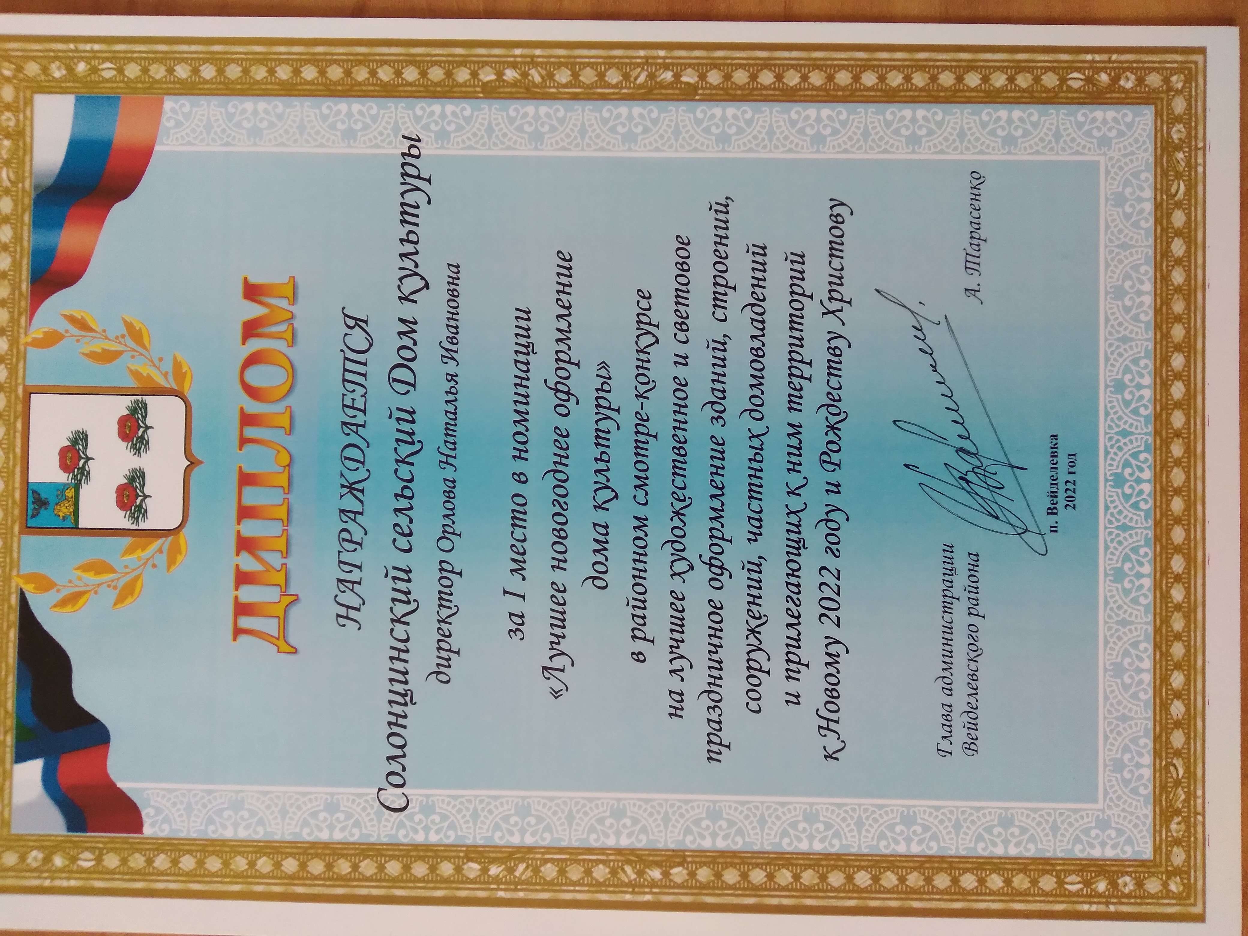 Награда за 1 место в номинации «Лучшее новогоднее оформление дома культуры»