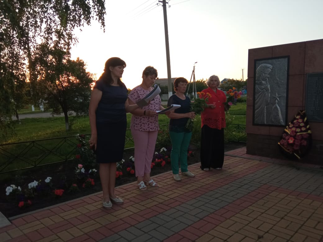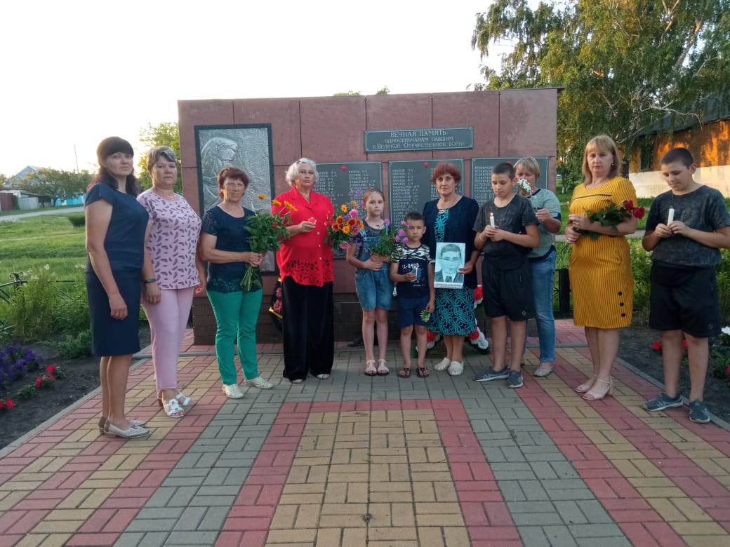 21 июня в 20:00 в селе Солонцы у обелиска «Погибшим воинам» состоялась Всероссийская акция «Свеча памяти», почтить память героев Великой Отечественной войны пришли те, кому не безразлична история нашей Родины. На мероприятии выступали: глава администрации Суслова В.П., председатель ветеранской организации Панина О.В. Ведущие, работники Дома культуры, исполнили трогательные стихи о войне, вызвав слезы у всех пришедших на мероприятии людей, после чего прозвучала минута молчания - в знак великой благодарности, тем, кого с нами нет! Все присутствующие возложили цветы и поставили свечи у обелиска. | |