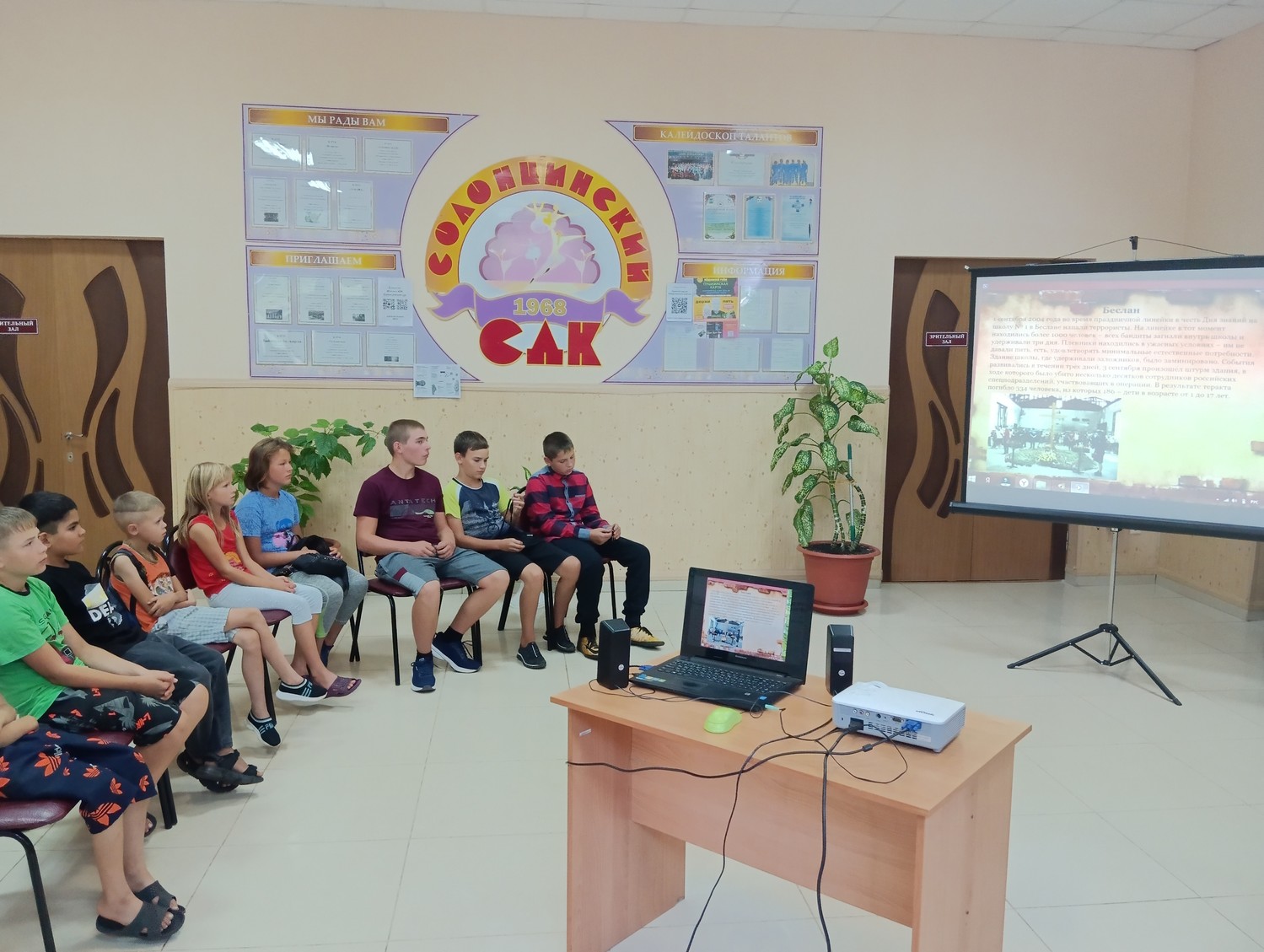 Ежегодно 3 сентября в России отмечается День солидарности в борьбе с терроризмом. В Солонцинском СДК прошёл информационный час «Терроризм пройди мимо». На мероприятии ведущая рассказала о страшных событиях, произошедших в городе Беслане с 1 по 3 сентября 2004 года, объяснила детям основные правила поведения в ситуации с захватом заложников. Ребятам были продемонстрированы электронные презентации: «Поколение против террора» и «Мир без войны». Завершением мероприятия стала традиционная акция «Мы против террора», в ходе которой дети оставили отпечатки своих ладошек на белом листе бумаги, как знак протеста терроризму. | |